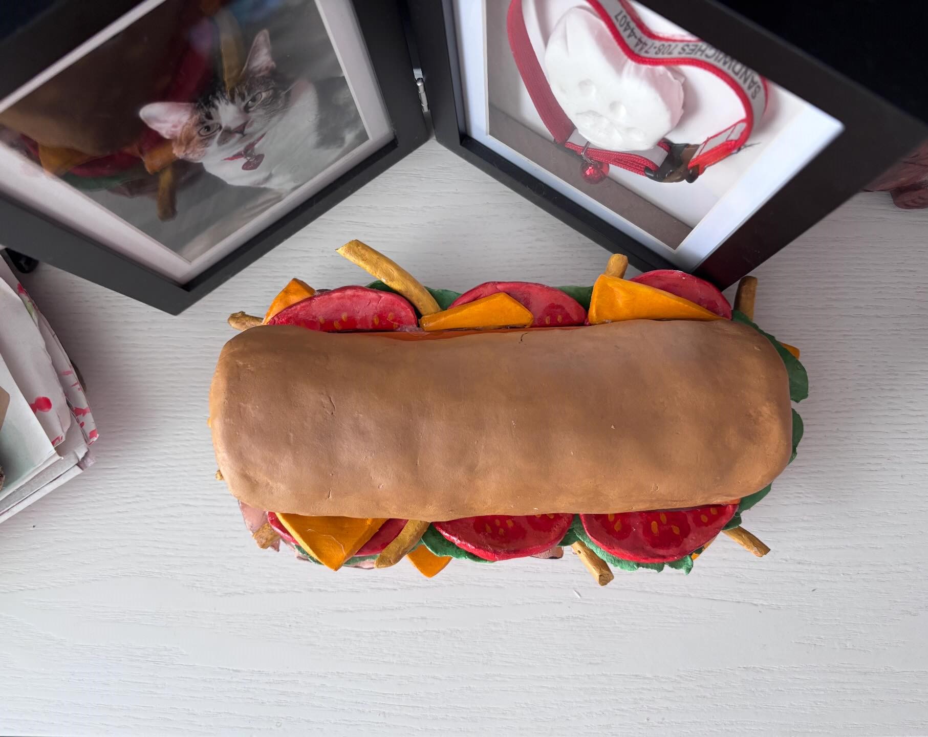 The finished piece looks like a hyper-realistic sandwich, complete with layers of deli meat, lettuce, tomatoes, and even small details like French fries tucked inside, a nod to Sandwiches’ favorite foods.