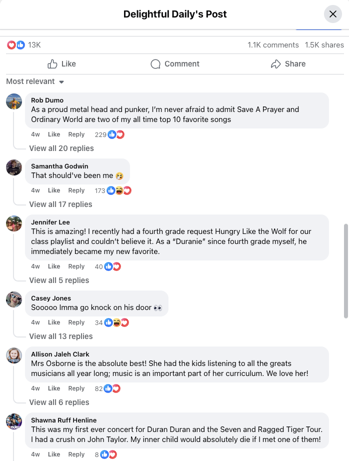 The story spread quickly. Parents and teachers shared it around the White Rock Elementary community, and soon NBC DFW picked it up. From there, it went viral online, circulating through fan groups and social media networks. Admirers praised Simon Le Bon’s generosity and Ava’s courage, calling it one of the most heartwarming celebrity encounters they had ever seen.